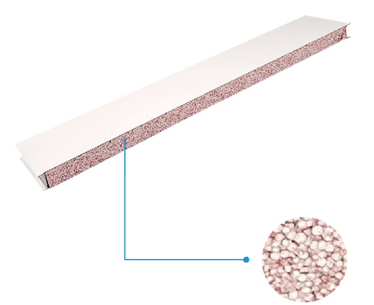 采用阻燃型 EPS 为芯材,热镀锌彩涂板为面层 ( 两层 ) 及高强度粘剂,通过高速连续自动化成型机加温、加压复合,裁切、修边而成的新一代建筑装潢板材。